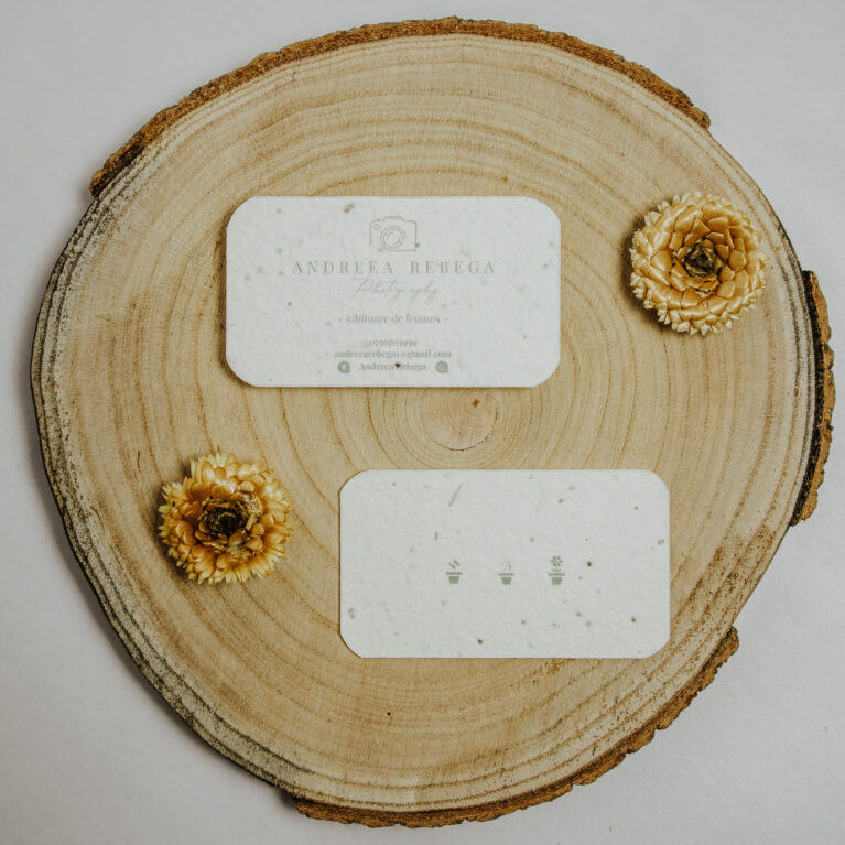 Carti de vizita realizate din hartie plantabila cu seminte de flori de primavara.